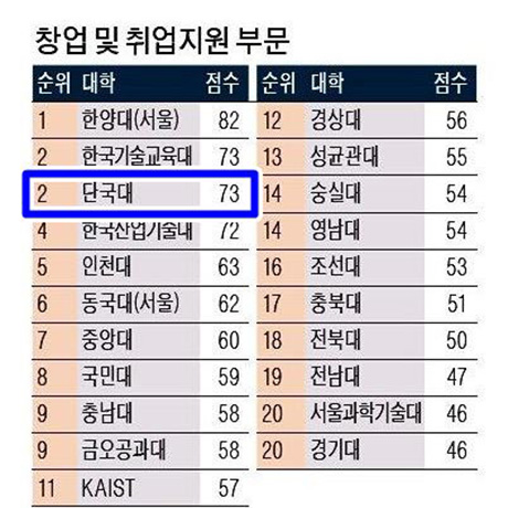 ▶우리 대학은 창업 및 취업지원 부문에서 전국 2위에 해당하는 73점을 얻었다.