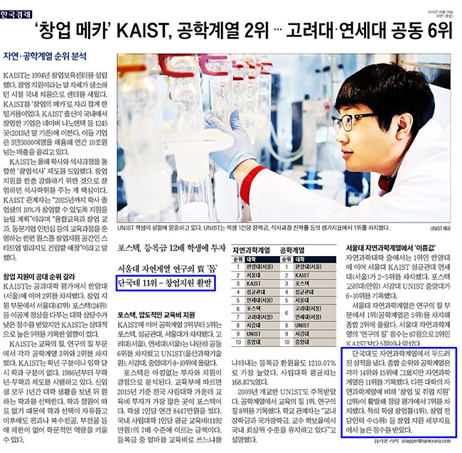 ▶한국경제신문 6월 8일 ‘2016 이공계 대학 평가’ 결과를 발표하며 우리 대학 자연과학계열에 대한 소개 기사를 실었다.(한국경제신문 2016년 6월 8일자 05면)