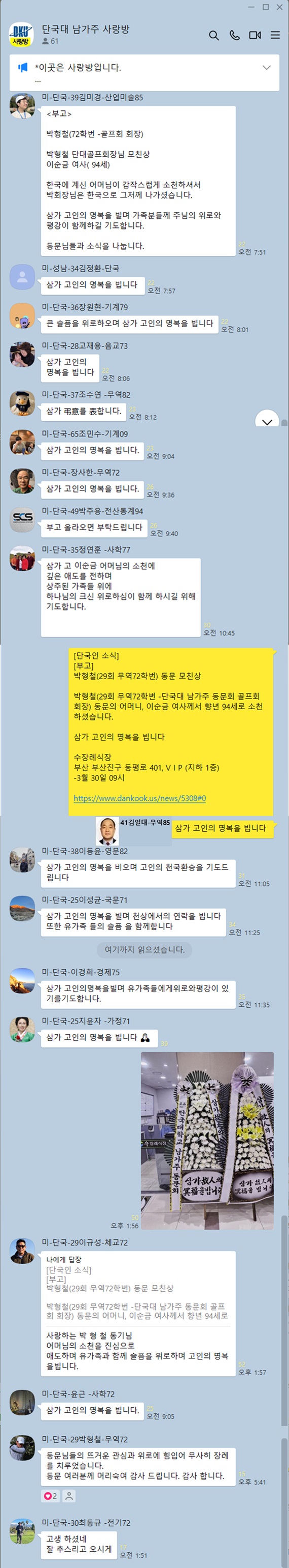 알려 드립니다 박형철(29회 무역72학번 -단국대 남가주 동문회 골프회 회장) 동문의 어머니, 이순금 여사께서 향년 94세로 소천하셨습니다. 삼가 고인의 명복을 빕니다 한국에 계신 어머님이 갑작스럽게 소천하셔서 박형철 동문께서 한국으로 그저께 나가셨습니다. 사랑하는 가족을 떠나 보내는 가장 힘든 시간, 유가족들께 깊은 위로의 말씀을 드립니다.